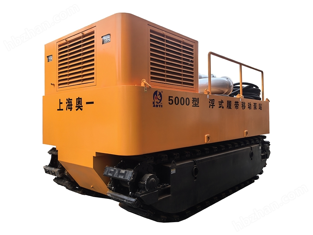 奥一5000型 水陆两栖多功能浮式履带移动泵站,采用了奥一公司产品便携式圆桶底吸潜水电泵与永磁同步变频控制柜控制的方式,效率高,流量、扬程更优;